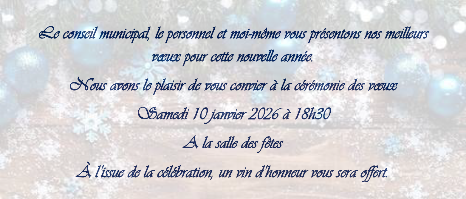 Partager cet article Partager sur FacebookPartager sur Facebook Partager sur WhatsAppPartager sur WhatsApp Partager sur TwitterPartager sur Twitter Navigation articlePrécédent Article précédent :« MENU CANTINE JANVIER »SuivantArticle suivant :« ÉLECTIONS MUNICIPALES 2026 »Articles similaires« Commémoration de l’Armistice du 11 novembre 1918 »27 octobre 2025« 80 ans de l’armistice du 8 mai 1945 »29 avril 2025« Vœux du Maire 2025 « 18 décembre 2024