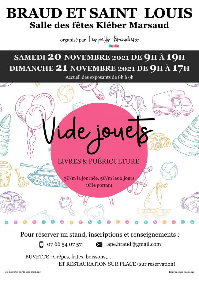 Le samedi 20 et le dimanche 21 novembre 2021 à la Salle des fêtes Kléber Marsaud à Braud et Saint Louis aura lieu un VIDE JOUETS : Livres et puériculture.