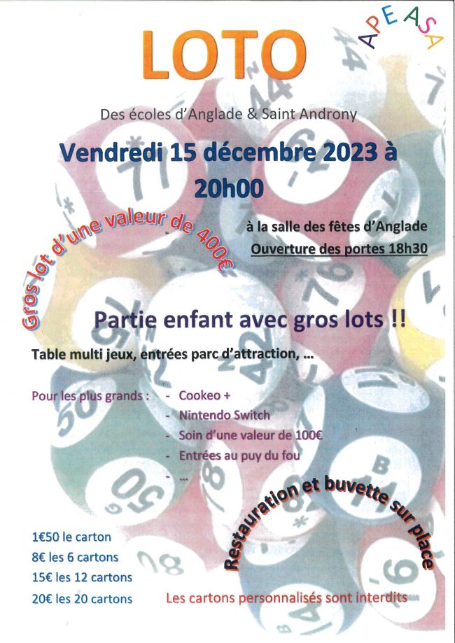 « LOTO DES ECOLES – LE VENDREDI 15 DECEMBRE A 20H A LA SALLE DES FETES » Events, ScolairesPar mairie1 décembre 2023